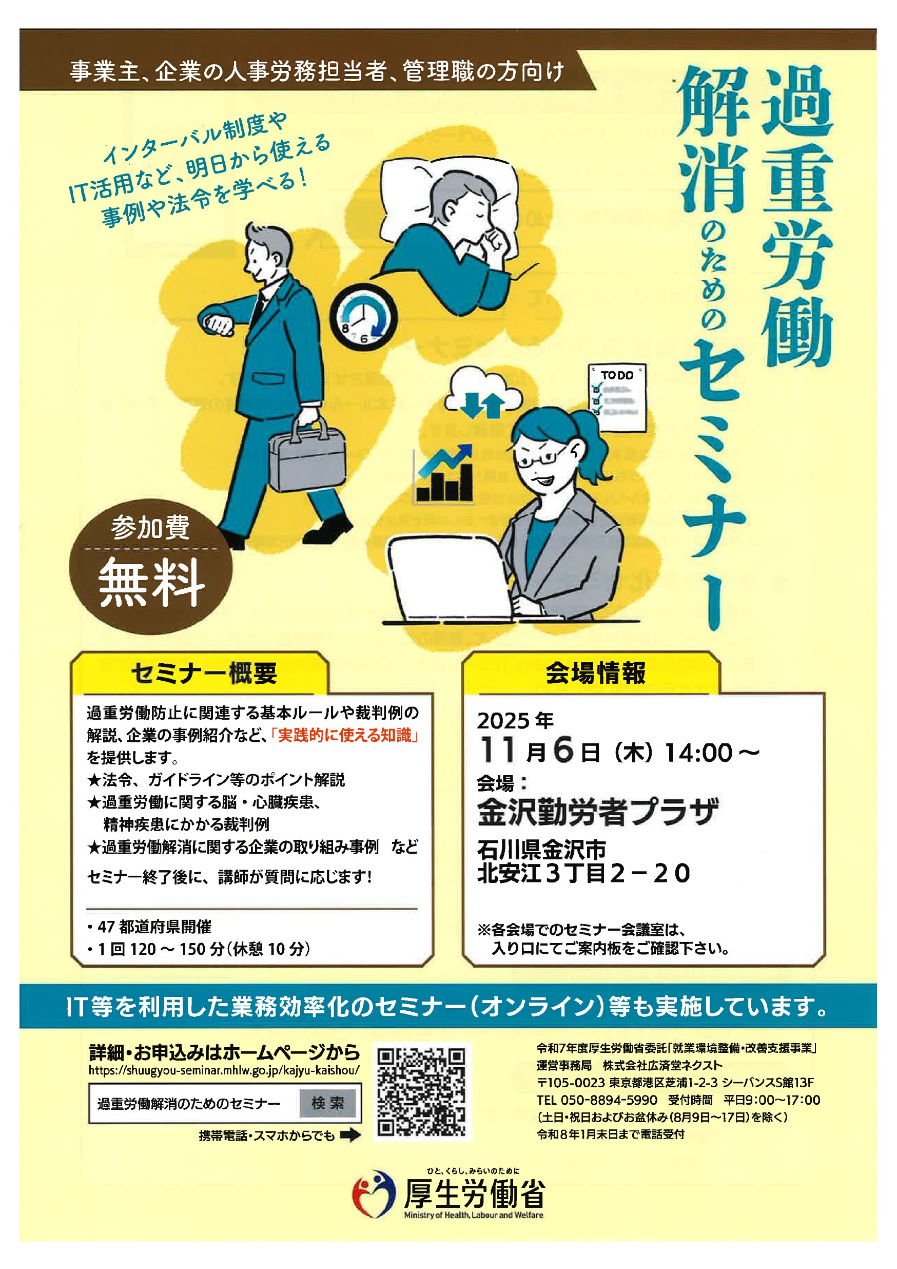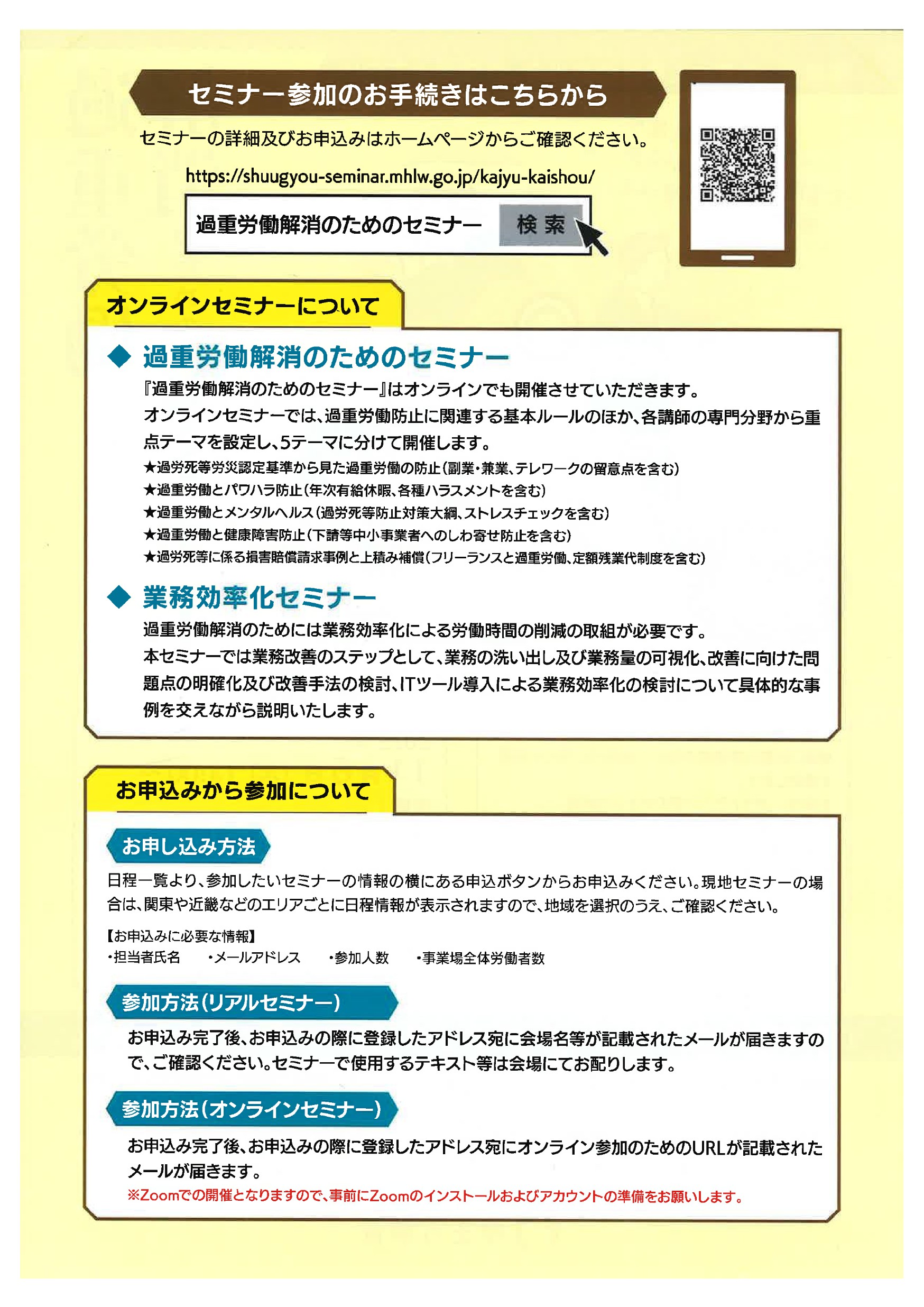 過重労働解消のためのセミナーでは、過重労働防止に関連する基本ルールや裁判例の解説、企業の事例紹介など、 「実務的に使える知識」を社会保険労務士などの専門家が無料で解説します。