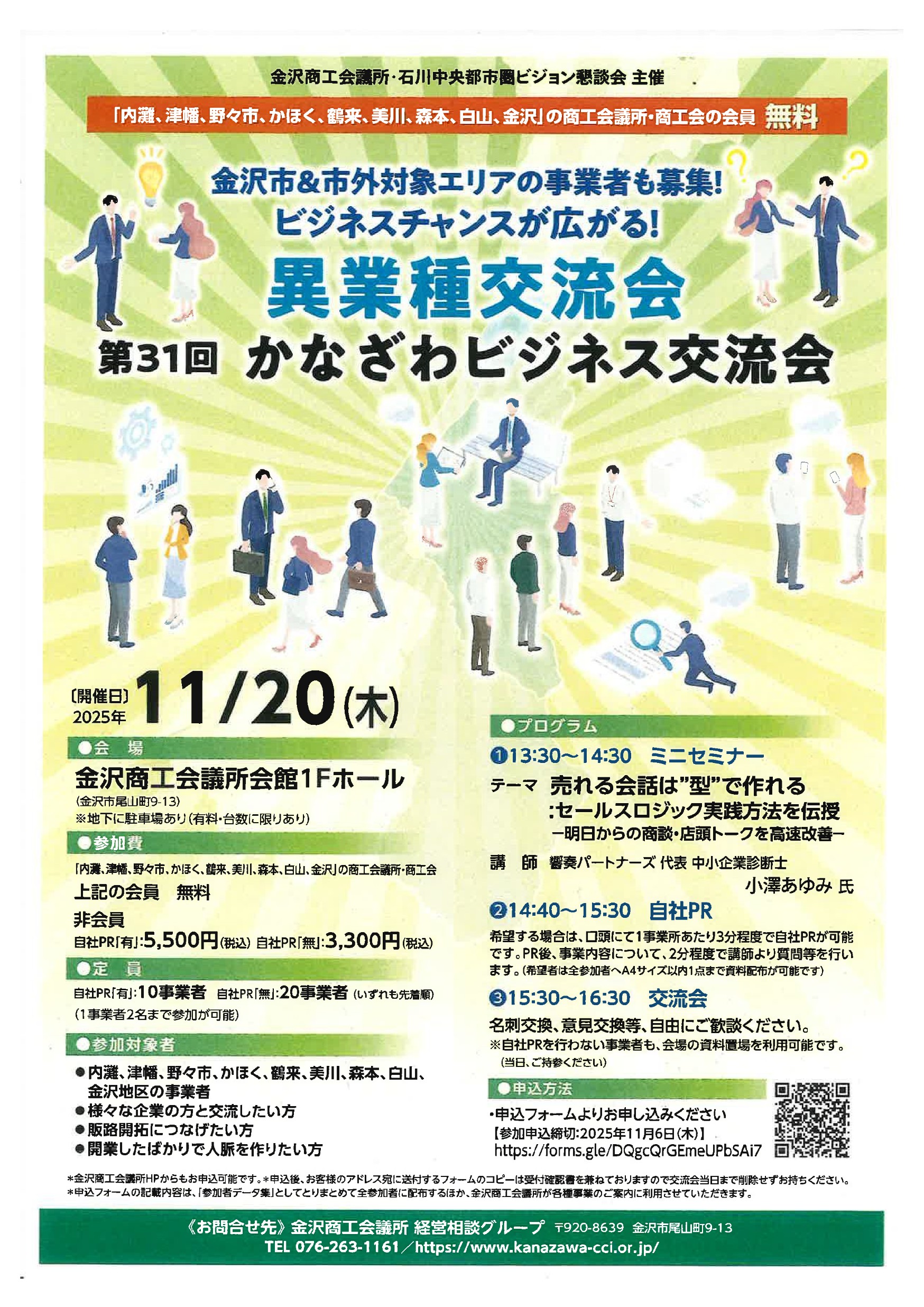 「金沢市&市外対象エリアの事業者も募集! ビジネスチャンスが広がる!異業種交流会 第31回 かなざわビジネス交流会」のご案内