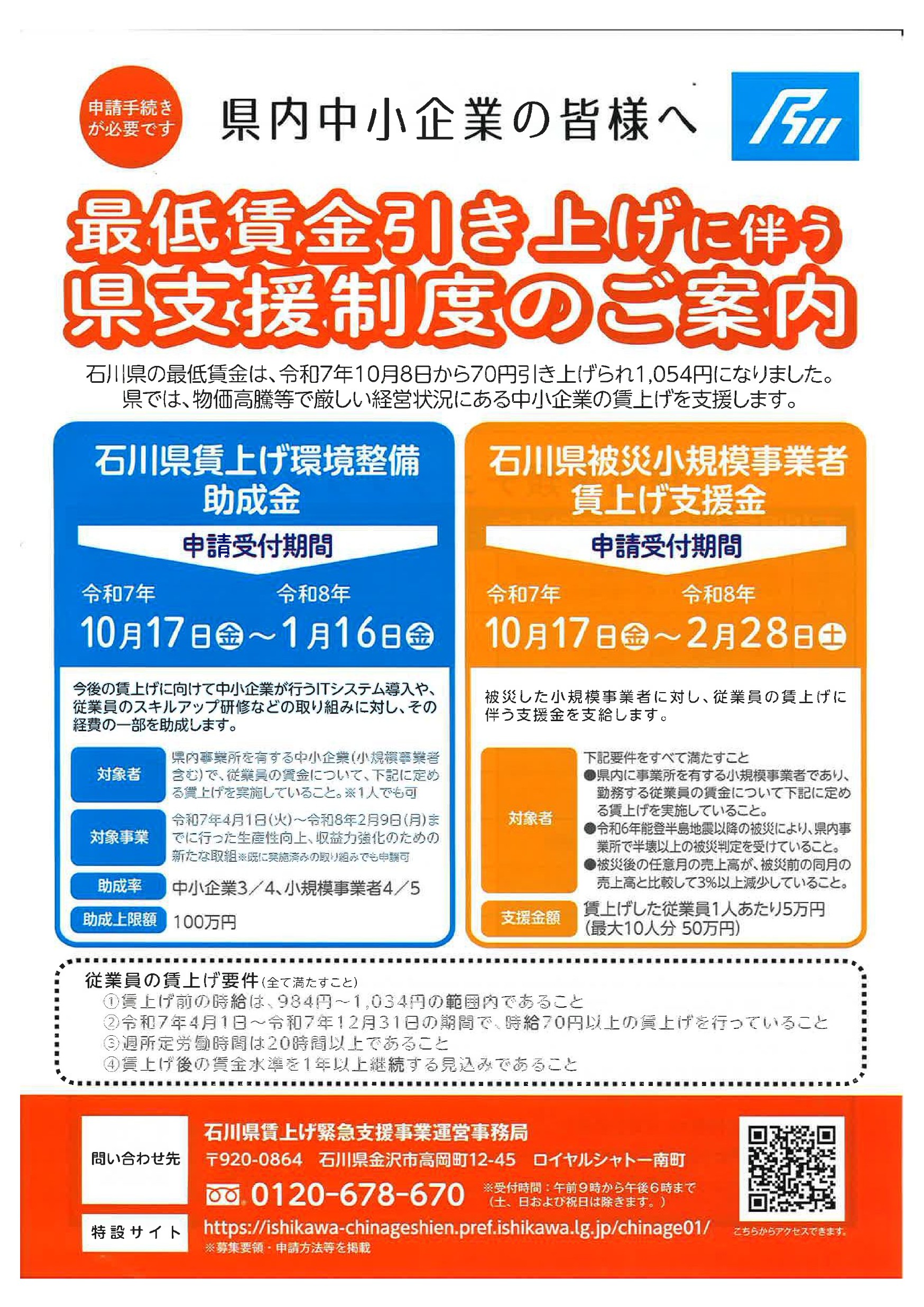 石川県の最低賃金は、令和7年10月8日から70円引き上げられ1,054円になりました。県では、物価高騰等で厳しい経営状況にある中小企業の賃上げを支援します。